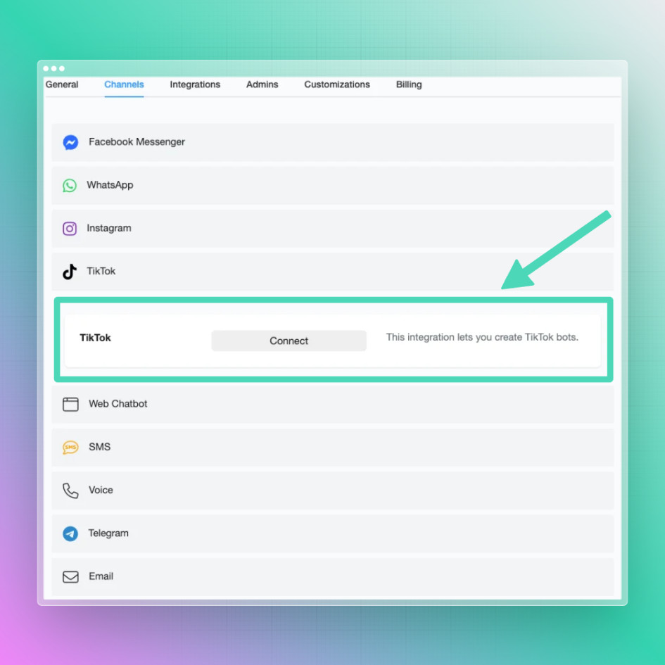 Don't limit yourself to TikTok. Build bots for Facebook Messenger, Instagram, WhatsApp, SMS, web chat, and now TikTok—all from one platform.
